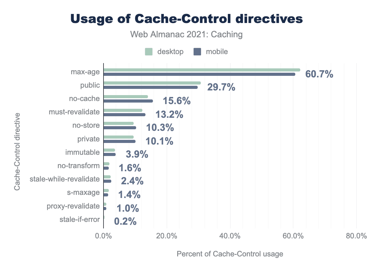 The most misused Cache-Control directive continues to be set-cookie, used for 0.07% of total directives for desktop and 0.08% for mobile. However, we are pleased to see a meaningful 0.16% reduction of usage from 2020.