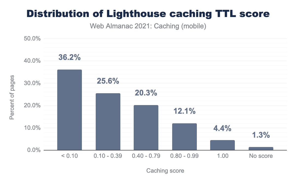 Based on the Lighthouse caching TTL score, we have seen an improvement in pages ranked with a perfect score of 100 increase from 3.3% in 2020 to 4.4% in 2021.