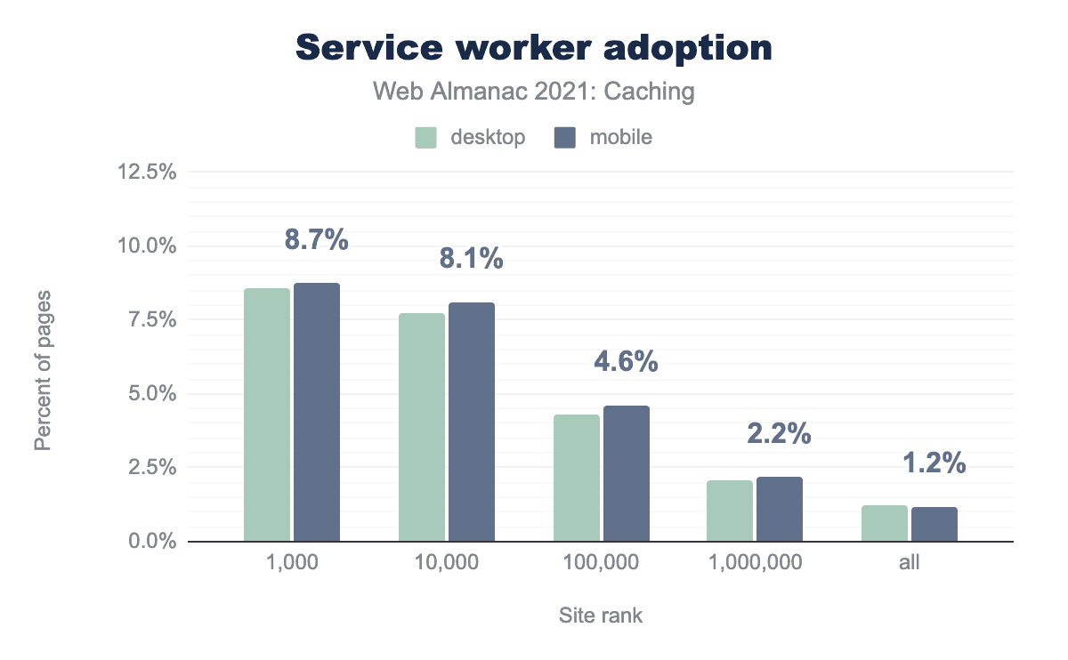 While just over 1% of pages registered a service worker, nearly 9% of pages ranked in the top 1,000 most visited domains registered one.