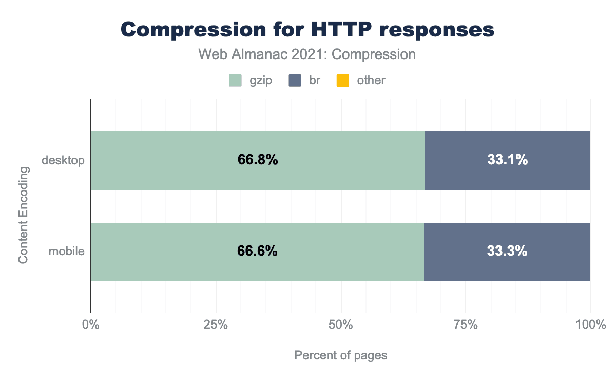 Of the resources that are served compressed, the majority are using either Gzip (66%) or Brotli (33%). The other compression algorithms are used infrequently. This split is virtually the same for desktop and mobile.