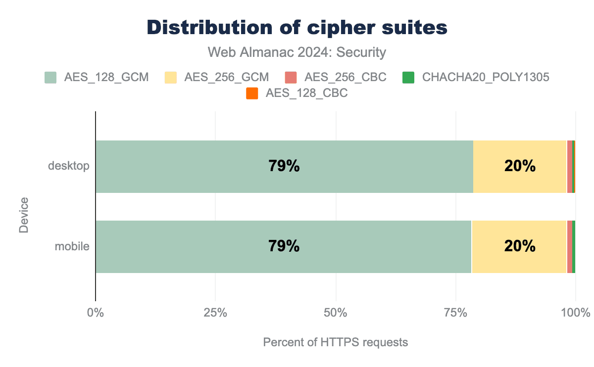 The number of requests served using TLS climbed another 4% to 98% on mobile since the last Almanac in 2022.