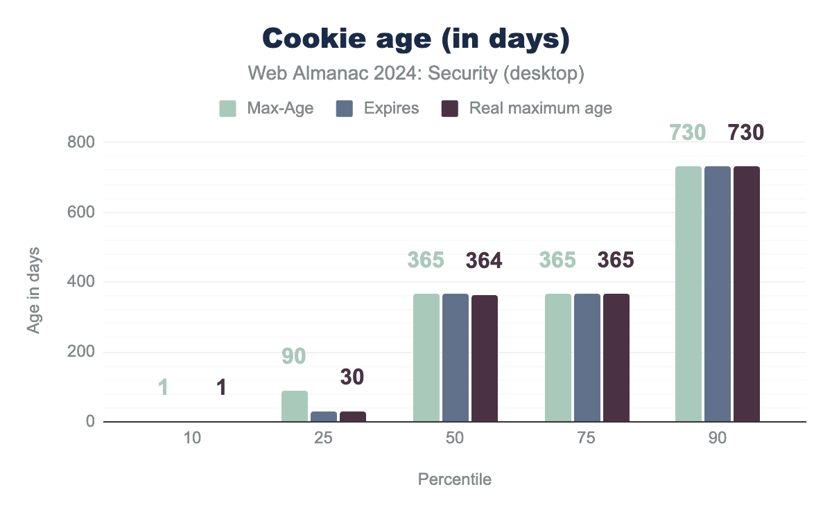 The distribution of cookie ages has remained largely unchanged compared to lat year. However, since then, the cookie standard working draft has been updated, capping the maximum cookie age to 400 days. This change has already been implemented in Chrome and Safari. Based on the percentiles shown above, in these browsers, more than 10% of all observed cookies have their age capped to this 400-day limit.